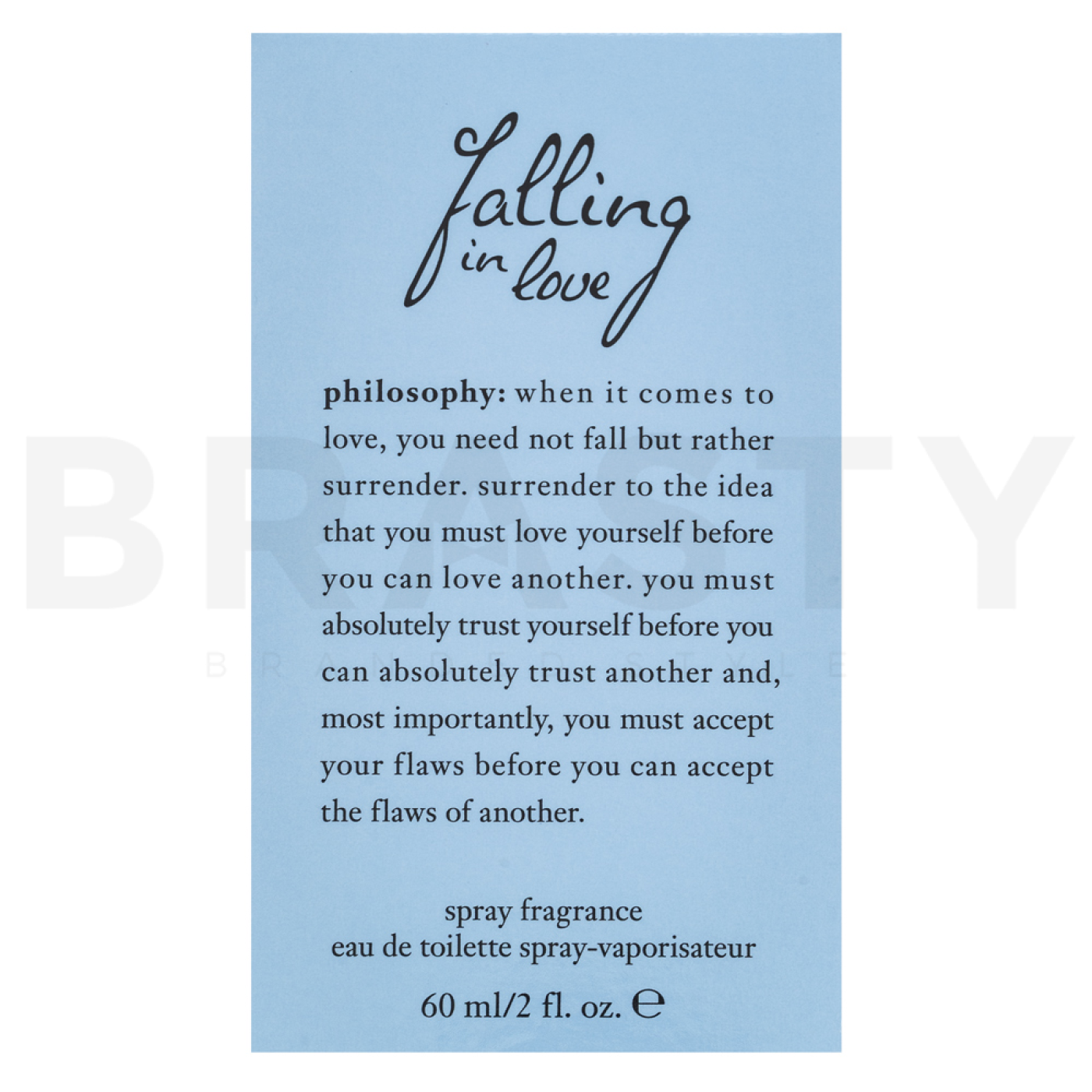 Filozofie značky Philosophy je postavená na jednoduchosti, čistotě a pozitivním přístupu k životu. Každý produkt v sobě nese myšlenku, že péče o tělo a pleť je nejen o kráse, ale také o duševní pohodě a radosti z maličkostí. Značka klade důraz na bezpečné složení, šetrné ingredience a etický přístup – produkty nejsou testovány na zvířatech a často využívají inovativní, ale zároveň jemné složení vhodné i pro citlivou pleť. Inspirace pro jednotlivé kolekce vychází z každodenních rituálů, pozitivního myšlení a jednoduchých radostí, což se odráží i v ikonických motivačních textech na obalech. Výraznou tváří značky byla například Ellen Pompeo a Philosophy je známá svým laskavým, inspirativním stylem komunikace, který oslovuje široké spektrum zákazníků.